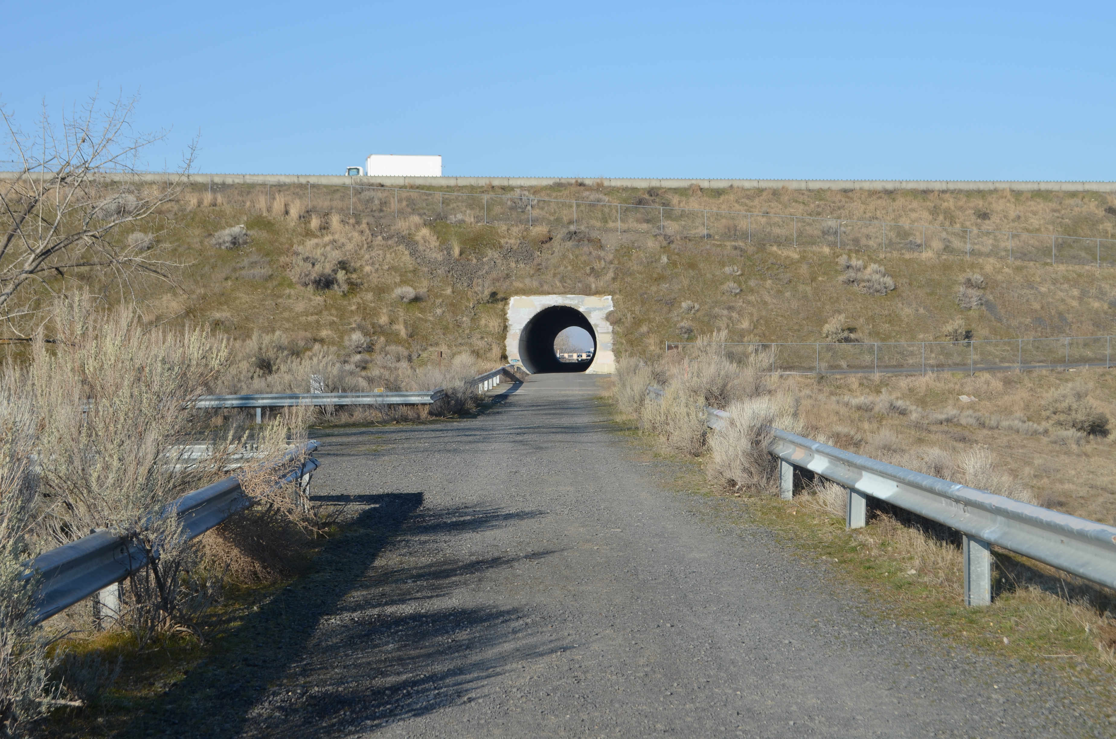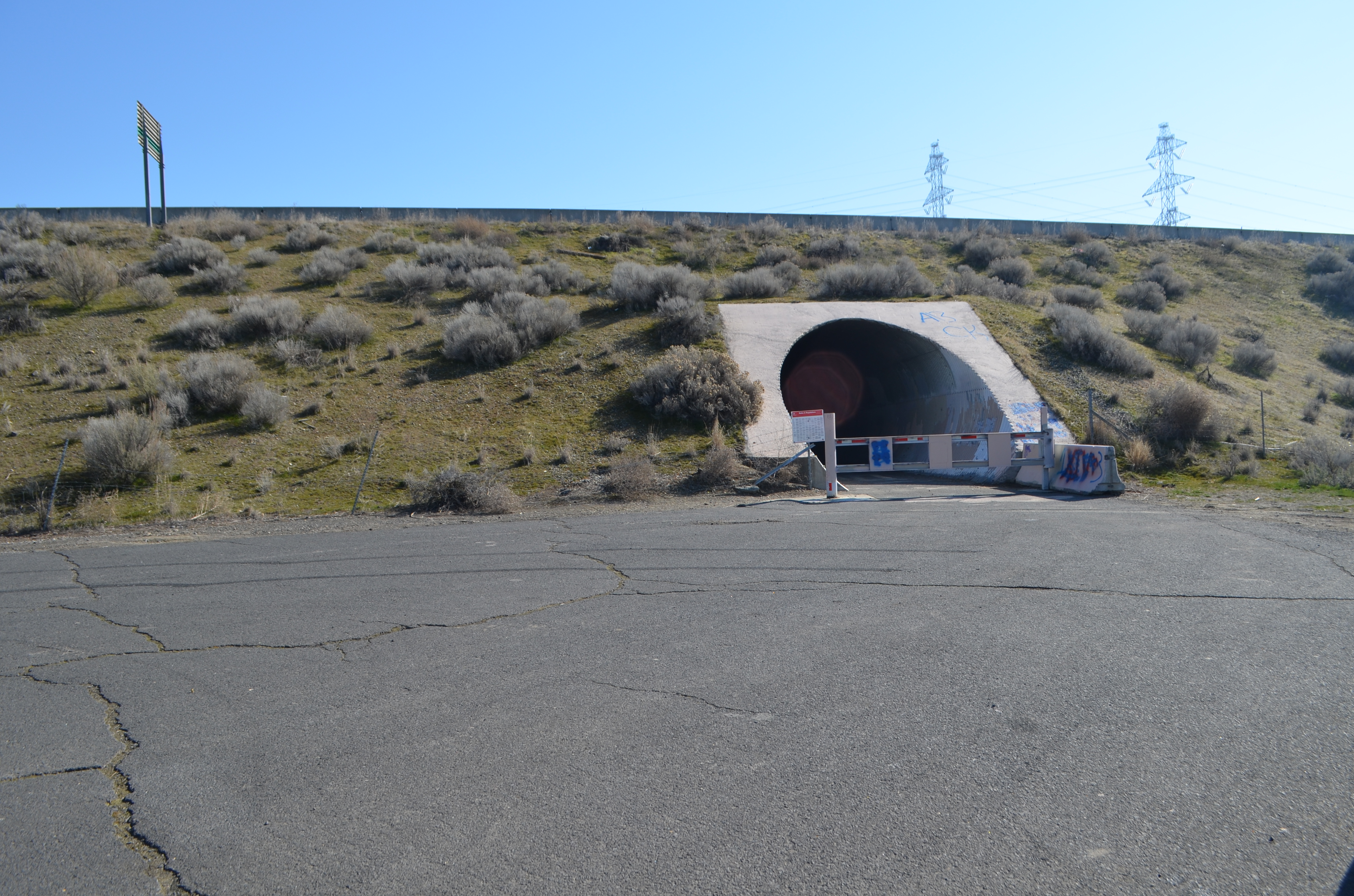 You park at a small turn-around area near the town of Plymouth, WA. There is a corrugated and paved 300′ tunnel which takes you underneath I-82 freeway.