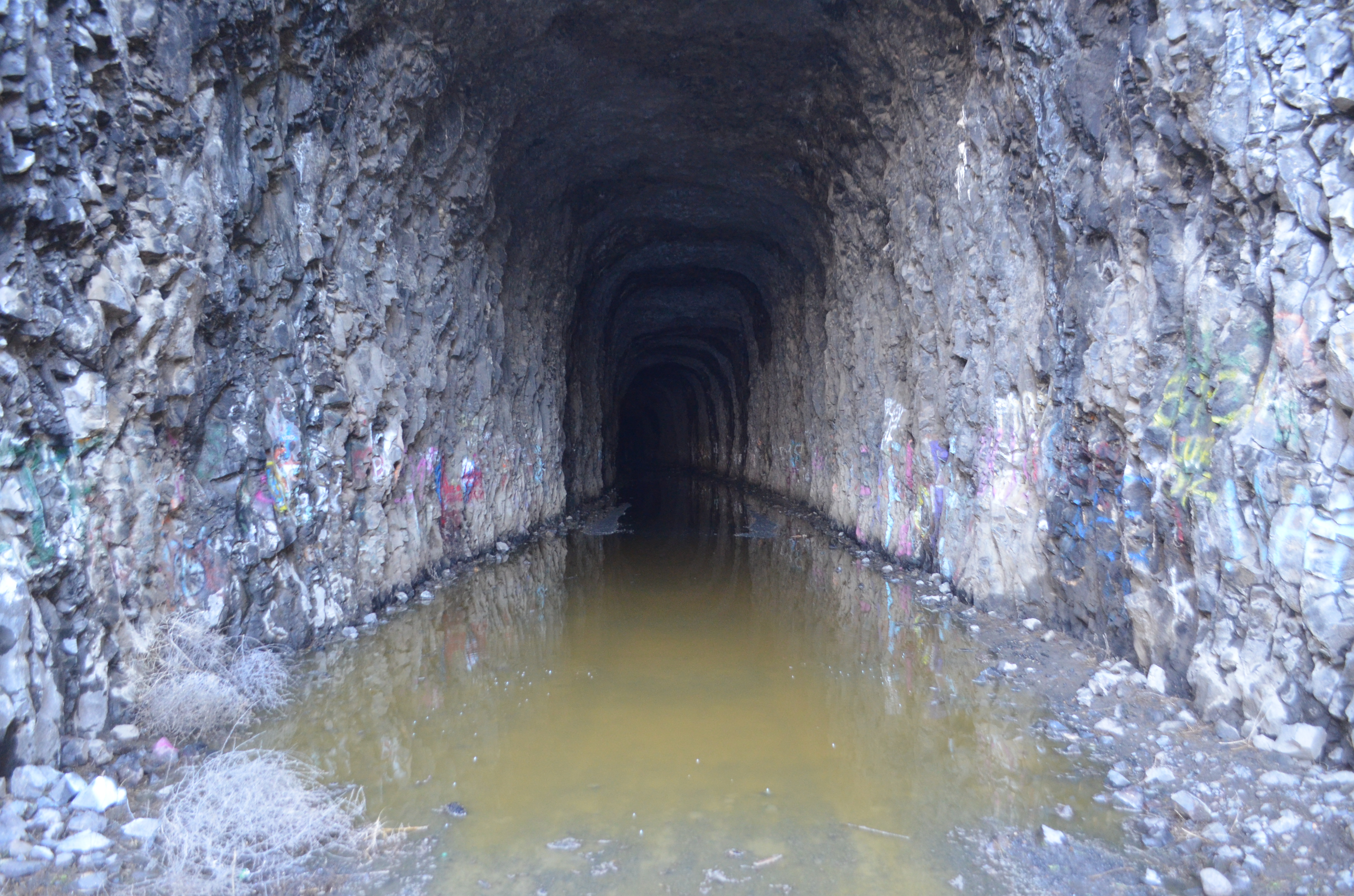A few hundred yards down the trail, you encounter an abandoned railroad tunnel which is fairly long and dark (make sure you bring fresh flashlights or headlamps as the footing can be difficult and there may be standing water).