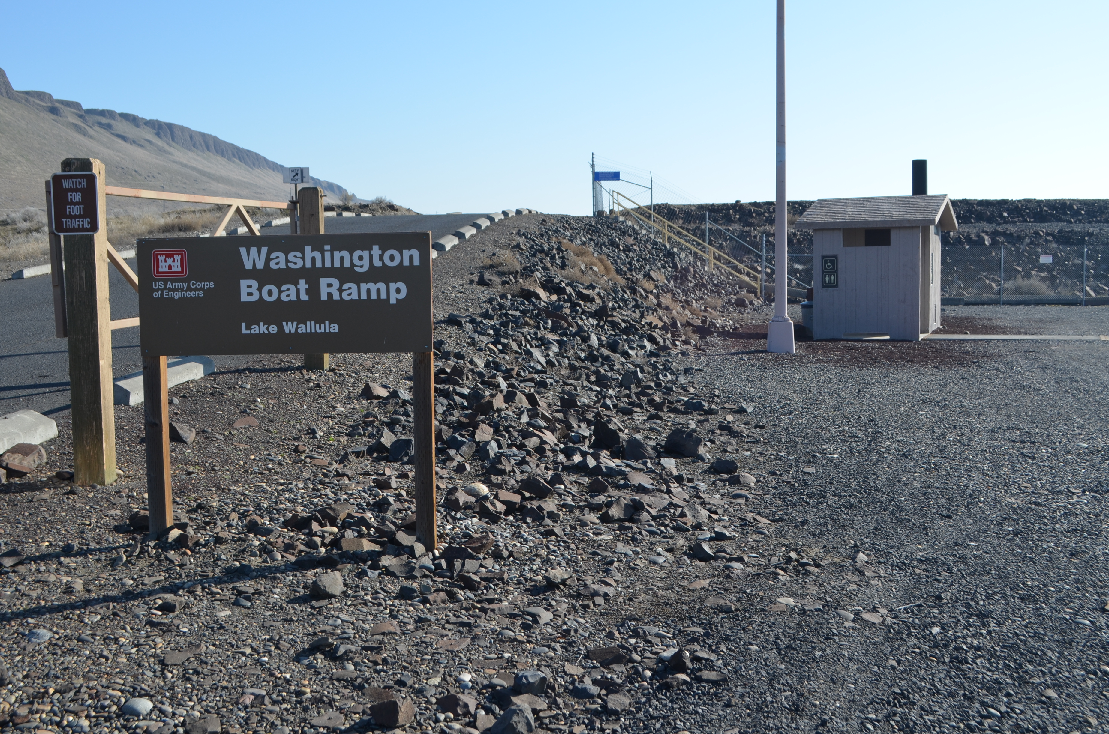 As you near the dam, you will have to go up a small road to avoid “no trespassing” government signs. Then, you head east again, toward the dam. You will eventually hit a paved road that will lead you up to a restroom and the McNary boat launch for boaters that want to launch above the dam.