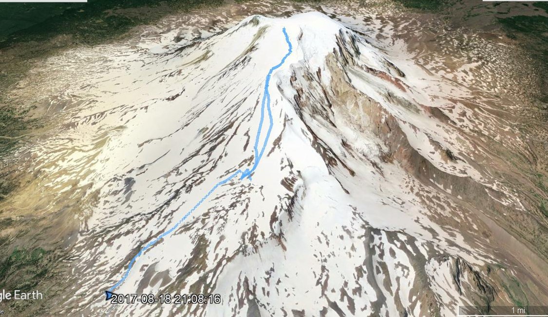 We all headed up Crescent Glacier, starting around 4:30 p.m. At this point, the elevation was around 8,000 feet. A small rock outcropping in the middle of the glacier served as a stopping point for some of the group who had loose or misadjusted or malfunctioning crampons. We spent a few minutes there and then continued up the mountain.